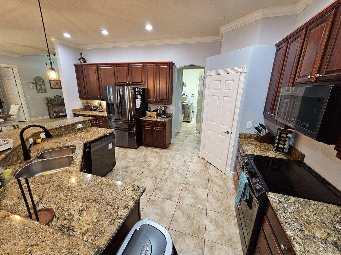 The open-concept kitchen is a chef's delight, equipped with black stainless steel Samsung WiFi-compatible appliances, a kitchen island with sink and dishwasher, and a walk-in pantry. Nearby, a spacious laundry room with a built-in sink and ample shelving space adds functionality.