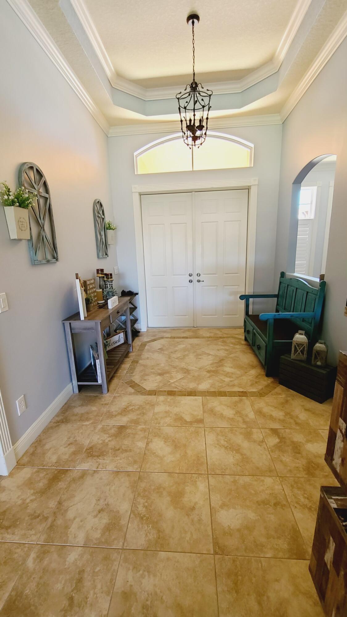 As you approach, you'll be greeted by a beautifully paved stone driveway leading to a spacious 2-car garage, complete with attic storage space. A large portico ensures you stay dry on rainy days as you step through the impressive French front doors into a home that boasts 10-foot vaulted ceilings and a direct view of the screened-in porch, pool, and sundeck.